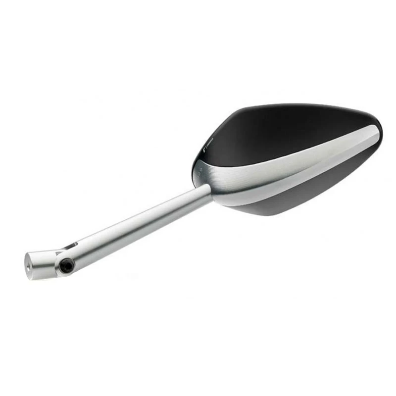 El espejo retrovisor Veloce se caracteriza por la especial combinación de dos materiales distintos. Parte estructural en aluminio mecanizado a partir de un bloque macizo mediante proceso 3D y cuerpo aerodinámico en polímero. El uso de dos materiales distintos, además de hacerlo atractivo, limita el peso. La forma aerodinámica contribuye a evitar turbulencias a alta velocidad. La amplia superficie reflectante, conforme a las normativas europeas de homologación, ofrece una óptima visión en combinación con el sistema de regulación y el cristal convexo antideslumbrante. Un diseño cautivador, que se adapta perfectamente a las naked más atractivas.