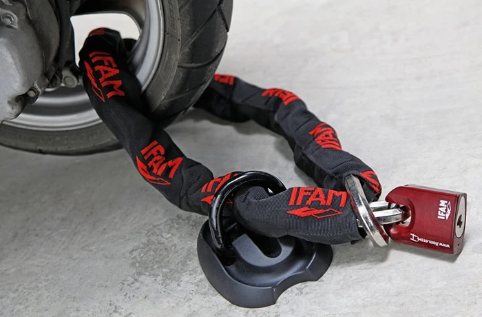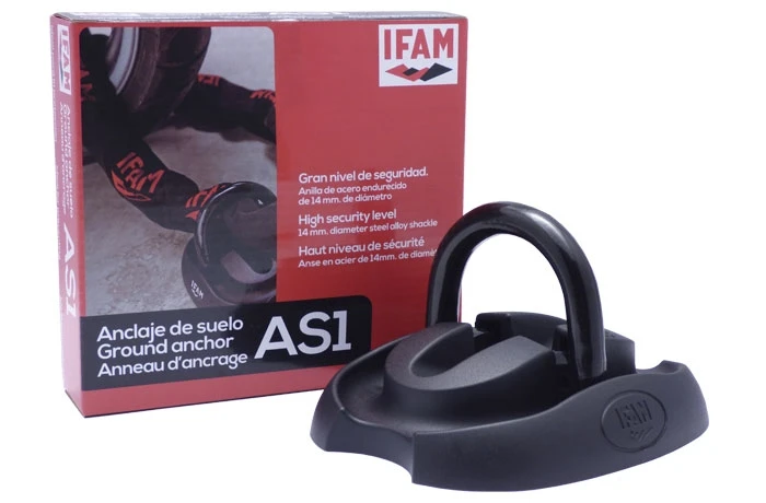 El anclaje de suelo AS1 de IFAM le proporciona la máxima garantía de seguridad para evitar el robo tanto de motocicletas como de elementos pesados de uso industrial, caso de grupos electrógenos, compresores, etc… Su anilla de aleación de acero de 14 milímetros de espesor y su gruesa base de acero de 6 milímetros son el soporte ideal para, en combinación con las cadenas IFAM y los candados de alta seguridad de la marca, conseguir una seguridad total..