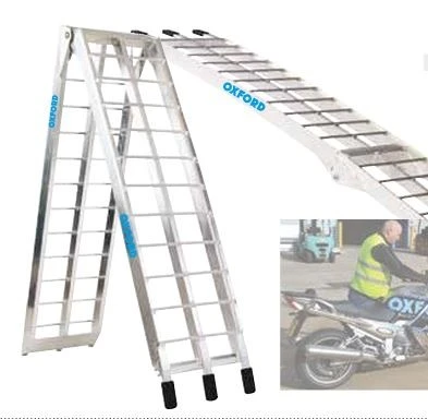 Diseñado para su uso con las motos de hasta 340kg • Diseño ancho es ideal para su uso por 1 persona • Construcción plegable ligero hace que la rampa fácil de guardar cuando no se utiliza • Correa Velcro Único mantiene la rampa cerrada con seguridad cuando lo transporte • Puede engancharse en un 13 mm / 1/2 «bar en la cola de camioneta • PVC revestido tenedores de descanso para evitar rayar el vehículo • Incluye correas para sujetar la rampa al vehículo • Dimensiones: 2,1 m / 7 pies de largo x 27,5 cm / 11» de ancho